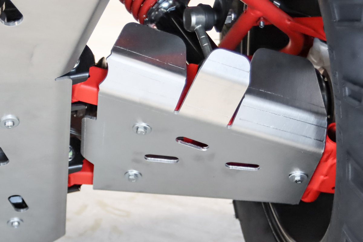 Aluminiowy zestaw płyt podwozia Shark to najlepsze rozwiązanie, aby w pełni ochronić podwozie quada przed uszkodzeniami mechanicznymi. Płyty wykonane są z lekkiego i wytrzymałego aluminium, dzięki czemu chronią pojazd przed kamieniami i wystającymi głazami, dodatkowo osłony wahaczy zasłaniają obudowę silnika przed uderzeniami. Płyty posiadają wygodne nacięcia, tak aby bez demontażu można było przeprowadzić serwis pojazdu.